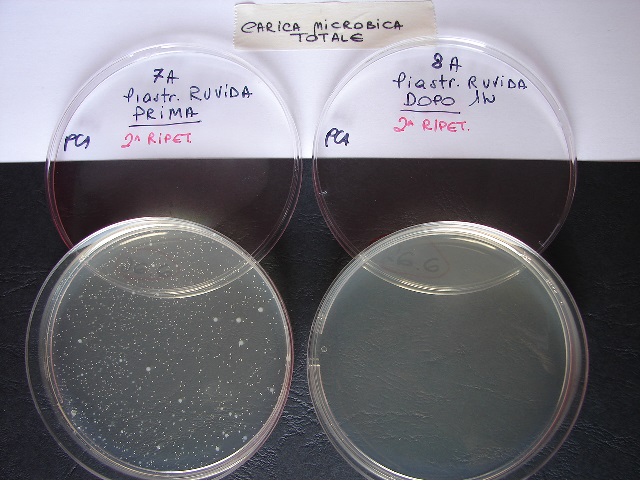 Dupa tehnicile microbiologiei traditionale a fost efectuata numararea microorganismelor prezente pe suprafete inainte si dupa expunerea suprafetelor la lumina solara.